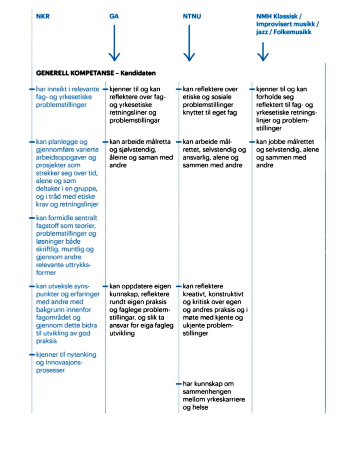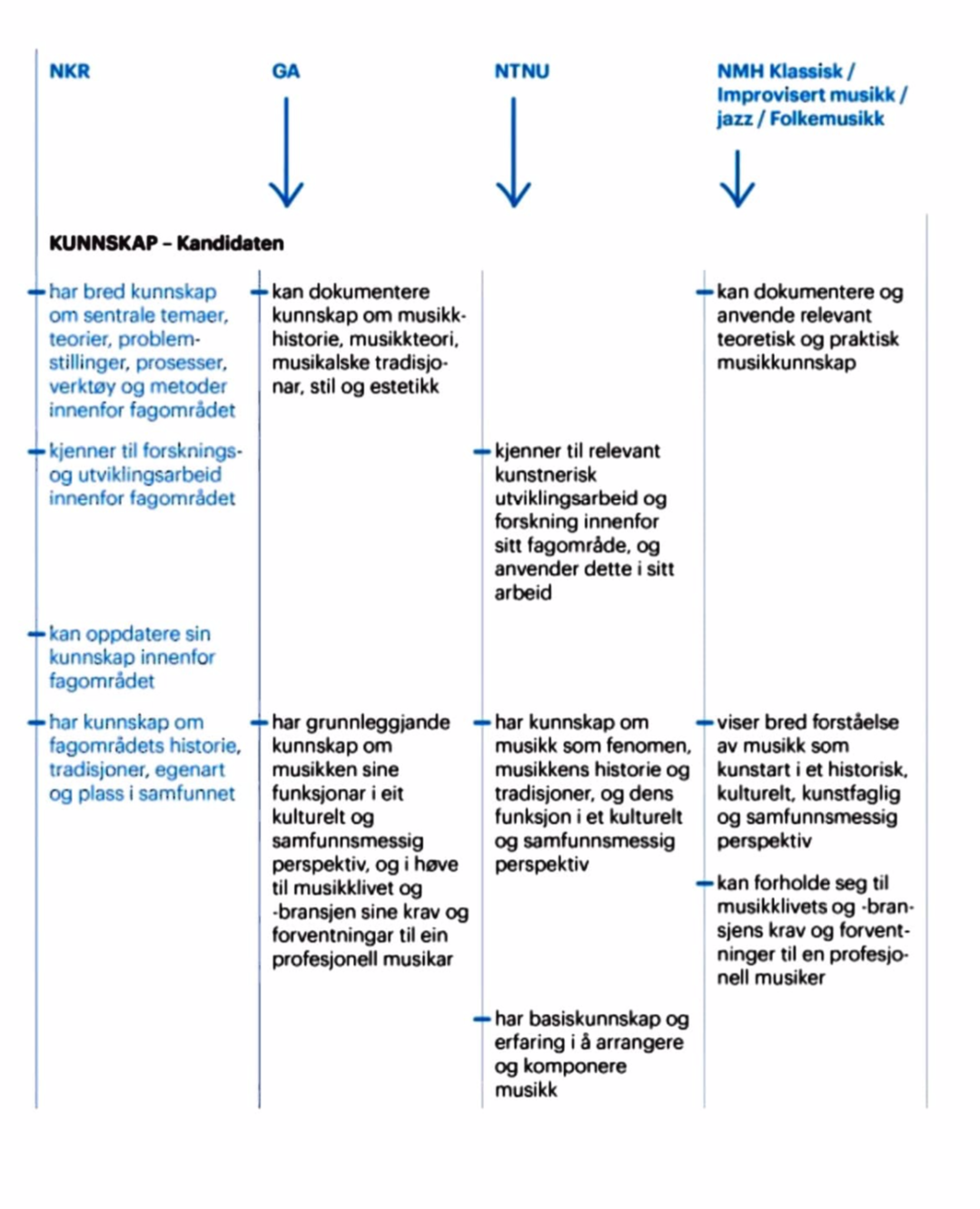 Mens GA og NTNU har delt inn læringsmålene i Kunnskap, Ferdigheter og Generell kompetanse slik som NKR, har NMH målene i en samlet liste. Vi har plassert NMHs mål i den raden vi mener passer best. De tre studieprogrammene har mange felles mål. Det er ikke så overraskende, gitt at de fleste av dem er basert på NKR og tilpasset det enkelte studium.